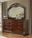 Cosmos Rosanna Dresser in Dark Cherry. Saving Grace. Give your bedroom all the grand eur and grace of American colonial style with our Cosmos collection. Presented in a stately dark cherry finish, each piece has a substantial silhouette and is adorned with such old world details, carved medallions, shaped mouldings and intricate scrollwork. The bed features a soaring headboard with a padded selected PU panel and on footboard, whose curves are echoes in the shaped fronts of the dresser, nightstand and chest for a carefully coordinated look.