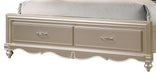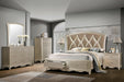Cosmos Furniture's Faisal transitional style Queen Bed has champagne finished wood which is an impeccable example of truly memorable luxurious transitional design. Your bedroom will be dignified fashion with this center piece. This semi arched panel bed has a beautifully designed headboard. It is intricated tufted upholstery along with geometric wood panels which compliments the crystals inlaid headboard frame. The footboard is perfect match with carvings details and Two (2) deep Drawers to increase the functionality of this bed. The drawers have dovetail construction with full extension glides and are dust proof. Bed has turned legs along nickel with crystal finished accented hardware. Matching Nightstand and more bedroom pieces are sold separately to complete the entire look of your excellent taste.