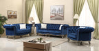 Cosmos Furniture's Mia transitional style navy blue Loveseat with silver finish wood. Creating an elegant and transitional design in your living room, the Mia Loveseat is your ideal choice. The Mia Loveseat puts a contemporary twist on the 15th century Chesterfield style. This large loveseat has rolled arms, the same height as the back, and tufting and nail-head trim. The silver finished wood base and legs are carved with detailed scrolls and flowers giving this piece a modern vibe. The Mia Loveseat will give you more seating room for family or friends and will create a warmer, comfortable, and friendly atmosphere. Throw pillows are included. Matching pieces are sold separately to complete the set.