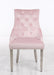 Cosmos Furniture's Leo transitional style Pink Chair in silver finish legs comes as a Set of Two (2) Chairs. Leo high back chair is a great addition to any room and could be matched with any dining table to add color. This modern design is perfect for your dining table, living room, bedroom and/or foyer providing dramatic layout. Built from a strong hardwood frame, covered with soft velour fabric, while complimented with a well-padded seat and tufted back is outfitted with nail head trim for extreme comfort. Accented with a chrome pull ring, and crystal, on the back, make the Leo Chair a signature piece in your home. Sold as a set of 2. MUST buy two (2) chairs. More colors available.