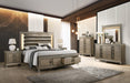Coral Contemporary Style Queen Bed in Bronze finish Wood, 67 x 65 x 80, 291lbs. Cosmos Furniture's Coral contemporary style Queen Bed in bronzed finish wood provides a commanding presence in any bedroom. This contemporary panel bed features a fully padded channel headboard which is framed by a decorative beveled Mirror accent that enhances the illumination from the touch-engaged LED backlit headboard. Footboard has additional two (2) storage drawers along with the acrylic legs which makes this a luxurious bedroom. - Contemporary Style Queen Bed - In Bronze finish Wood - Upholstered leatherette Headboard - Storage Drawers in Footboard - LED backlight Headboard - Bed frame with stable wood slats - Matching Nightstands sold separately - Matching bedroom suite pieces sold separately - Mattress Not Included - Box-spring needed - -